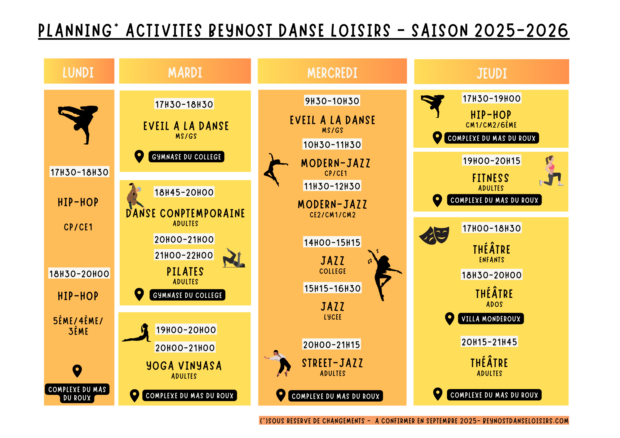Voici un récapitulatif du planning à date. En fonction du nombre d’inscrits à certains cours, nous nous réservons le droit de modifier, ajuster les activités concernées, en termes de jour, horaires et/ou nombre de places. Le planning ci-dessus sera définitif à partir du mois de septembre 2025. Les inscriptions seront ouvertes dans le courant du